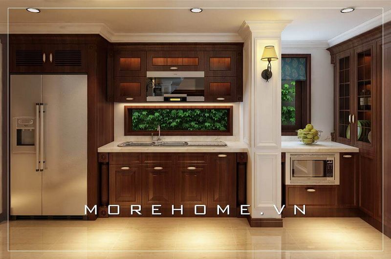 Thiết kế nội thất phòng bếp gỗ tự nhiên tân cổ điển sang trọng, tiện nghi cho nhà biệt thự