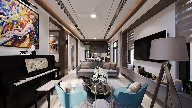 Không gian phòng khách nhà biệt thự sẽ trở nên đẹp hơn khi được trang bị nội thất hiện đại.