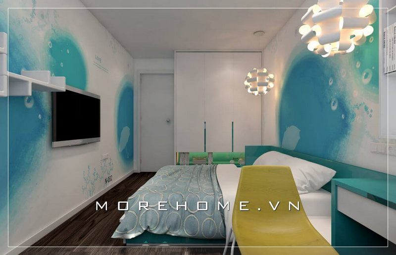 Trang trí nội thất phòng ngủ trẻ em đơn giản và tiện nghi, việc kết hợp giữa 2 màu sắc xanh - trắng chủ đạo tạo sự cuốn hút và thích thú